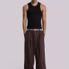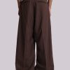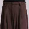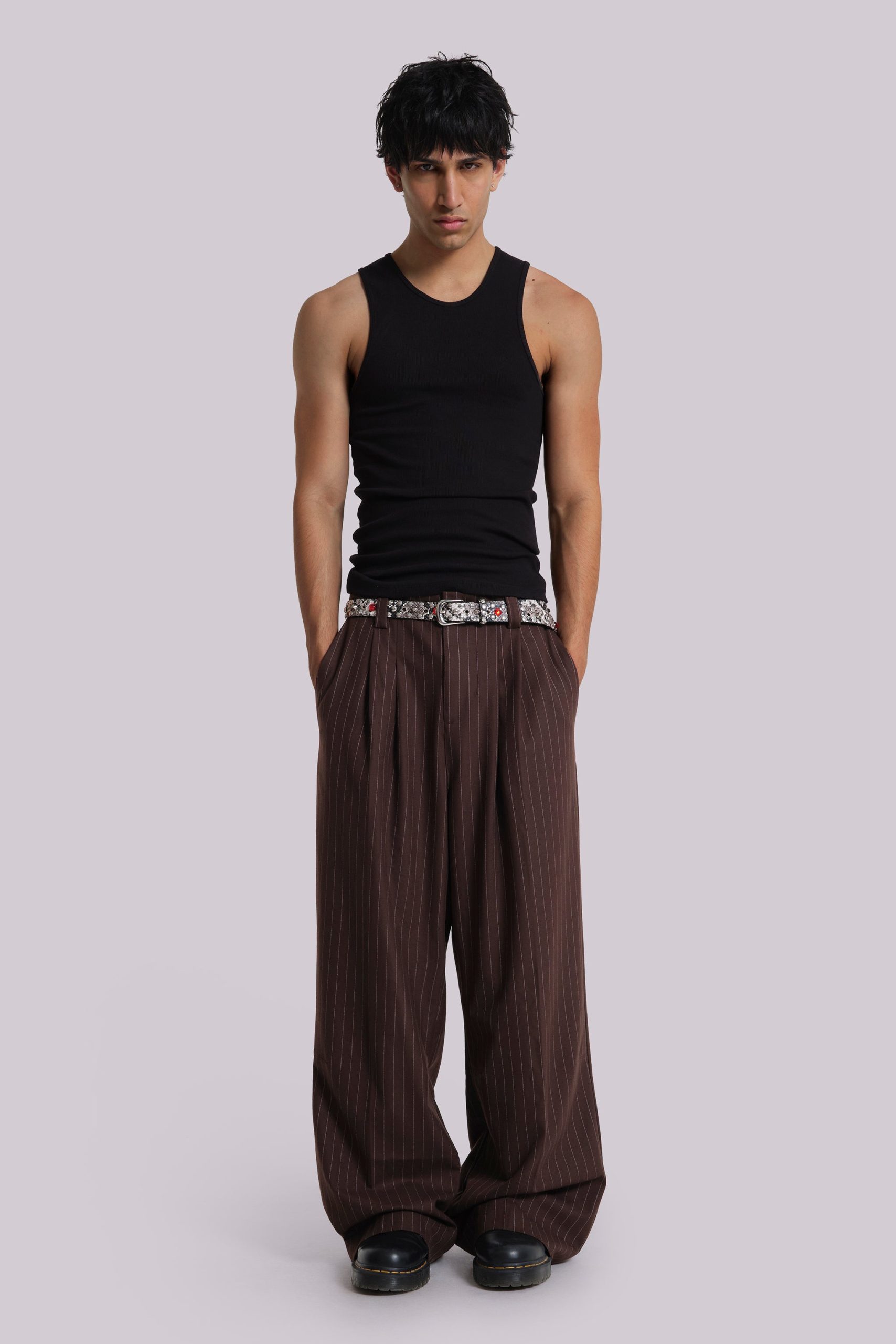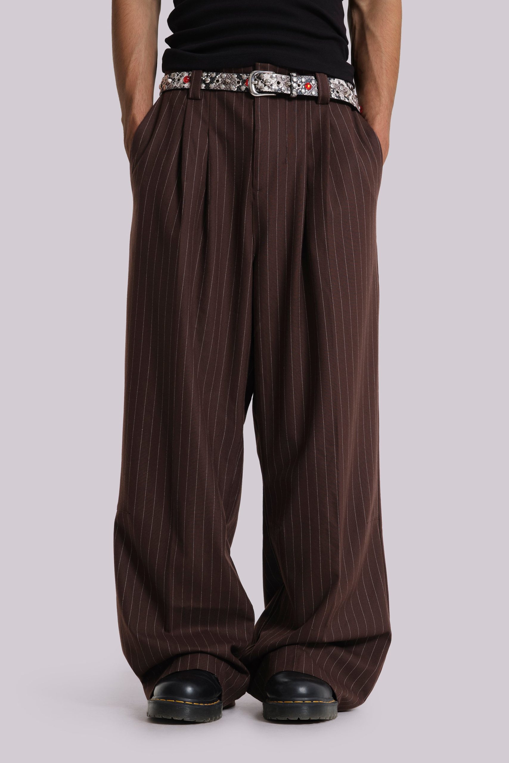 The Chocolate Brown Pinstripe Goliath Suit Pant is crafted with a classic mid-weight suiting fabric and twin pleats to the waistband for added volume. The design features a fixed waistband with belt loops and sits in a mid-low rise fit.