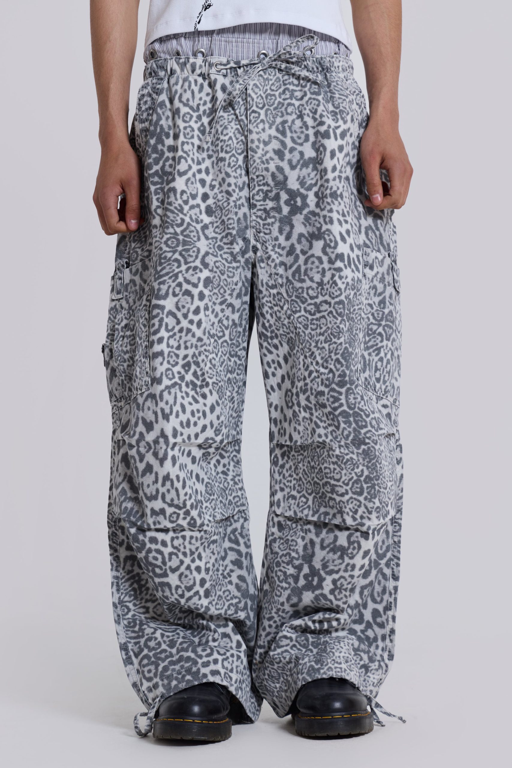 Designed with an oversized fit and a combination of metal eyelets, zip fly and adjustable cotton drawcord, our Snow Leopard Parachute Cargo Pants deliver refined luxury and ultimate comfort. Details such as a pleated knee and inside leg darts ensure a perfect fit, while a six-pocket styling and a unique airpod pocket provide functional convenience. Elevate any look with this timeless and classic silhouette.