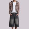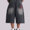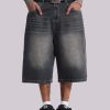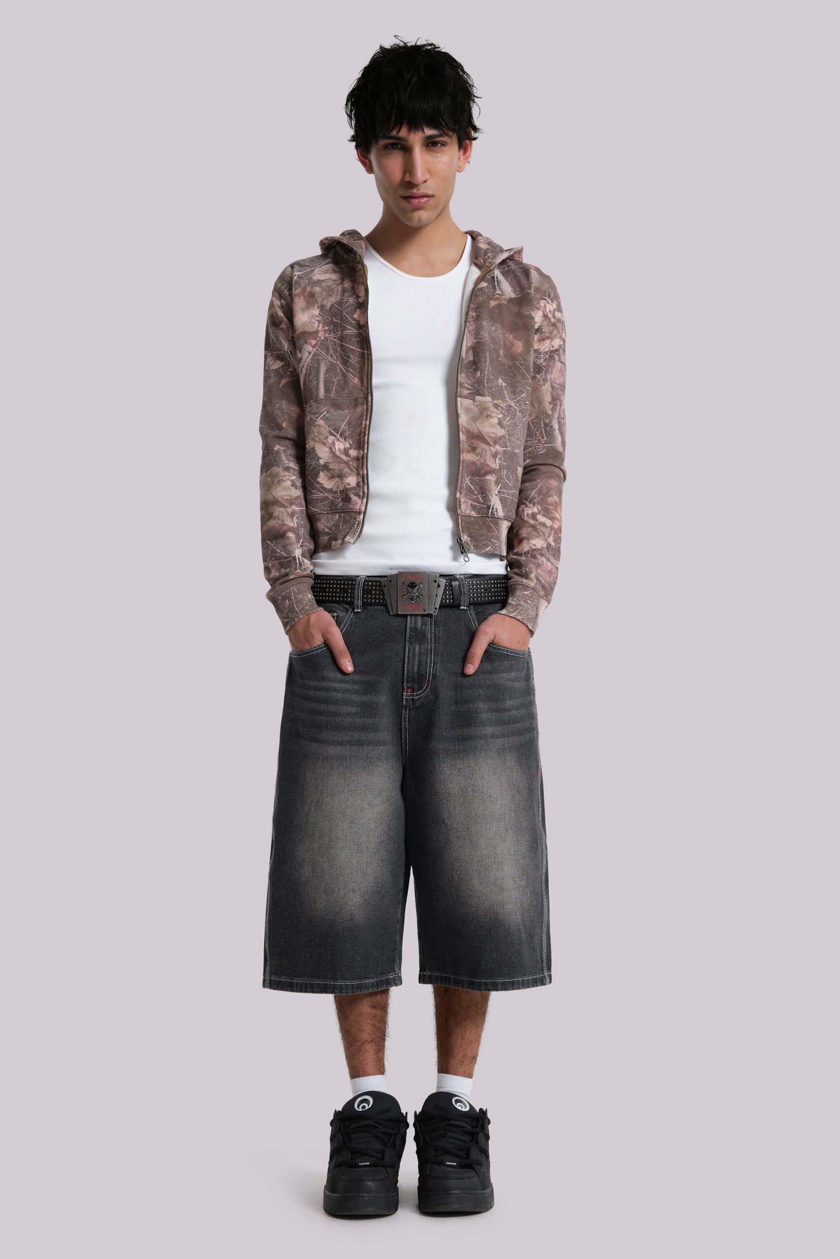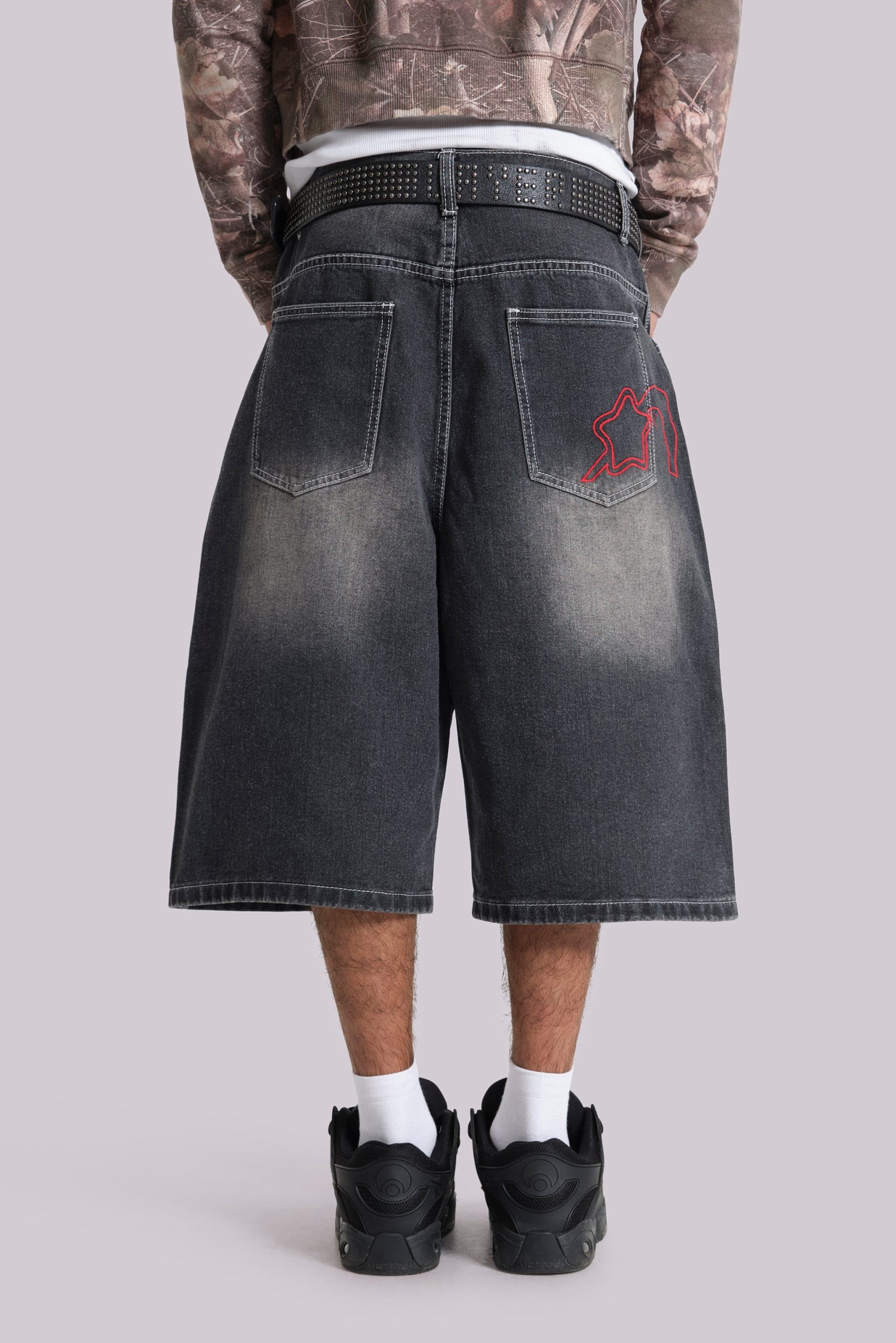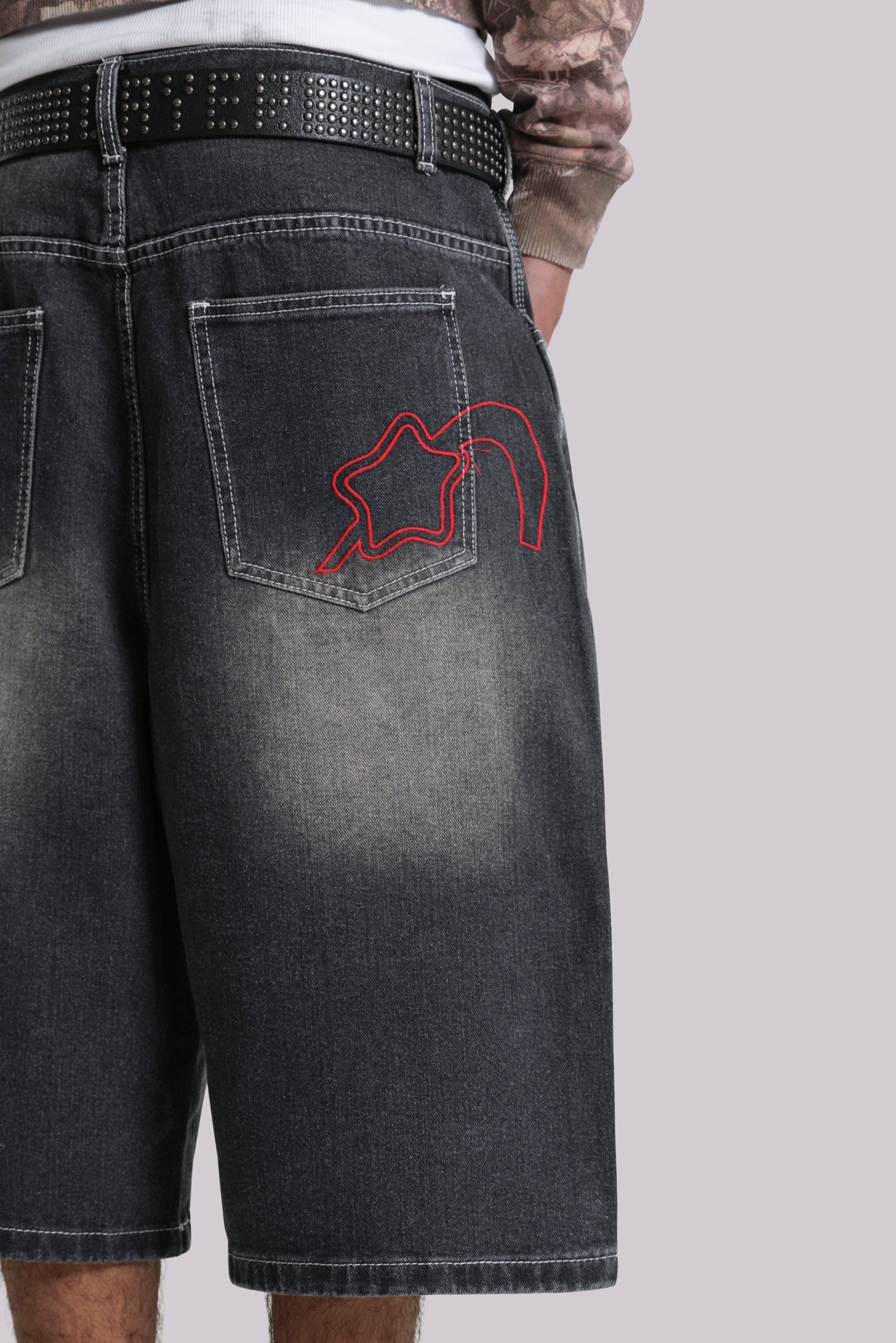 Introducing the Washed Black Jumbo Jorts “ crafted in a non-stretch washed black denim with a vintage wash, these jumbo fit jorts feature red star embroidery detail on the back, x5 pocket styling, belt loops at the waistband with antique silver metal rivets.