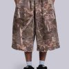 The Woodland Camo Monster Jogger Shorts are crafted from a fleece-back heavy sweat fabric boasting a super oversized fit, finished with raw-edge waistband details. These joggers are elevated with a length that falls just below the knee.