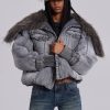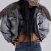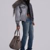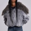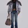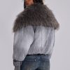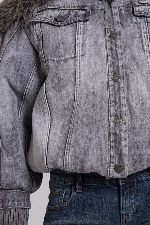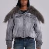 Grey wash denim bomber jacket with oversized fur collar and rib cuffs with belt detail.