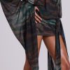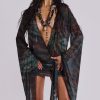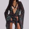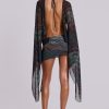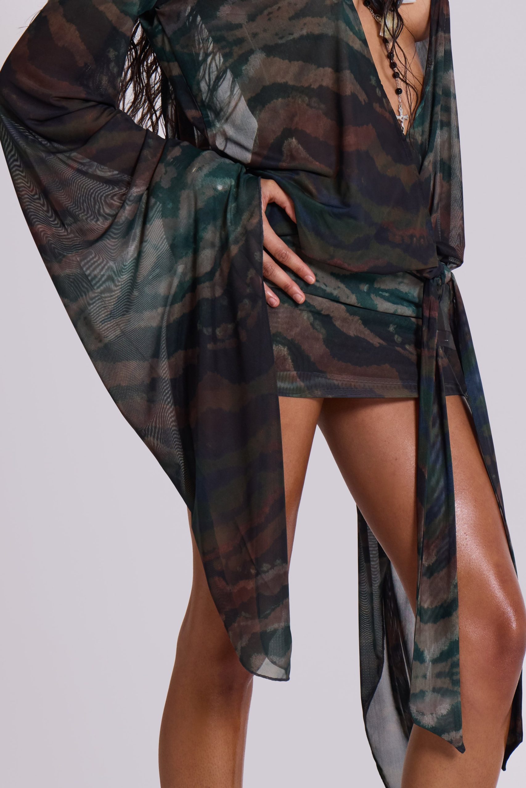 Aria Mesh Plunge Mini Dress. Abstract zebra print mesh mini dress with fitted skirt, open back, draped plunge body and dramatic extra long flared sleeves, and a detail at waist seam. Fastens with tie at back.