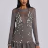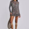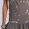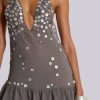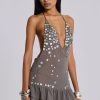 Button Me Up Mini Dress. Chiffon mini dress with backless shape and layered frill skirt.
