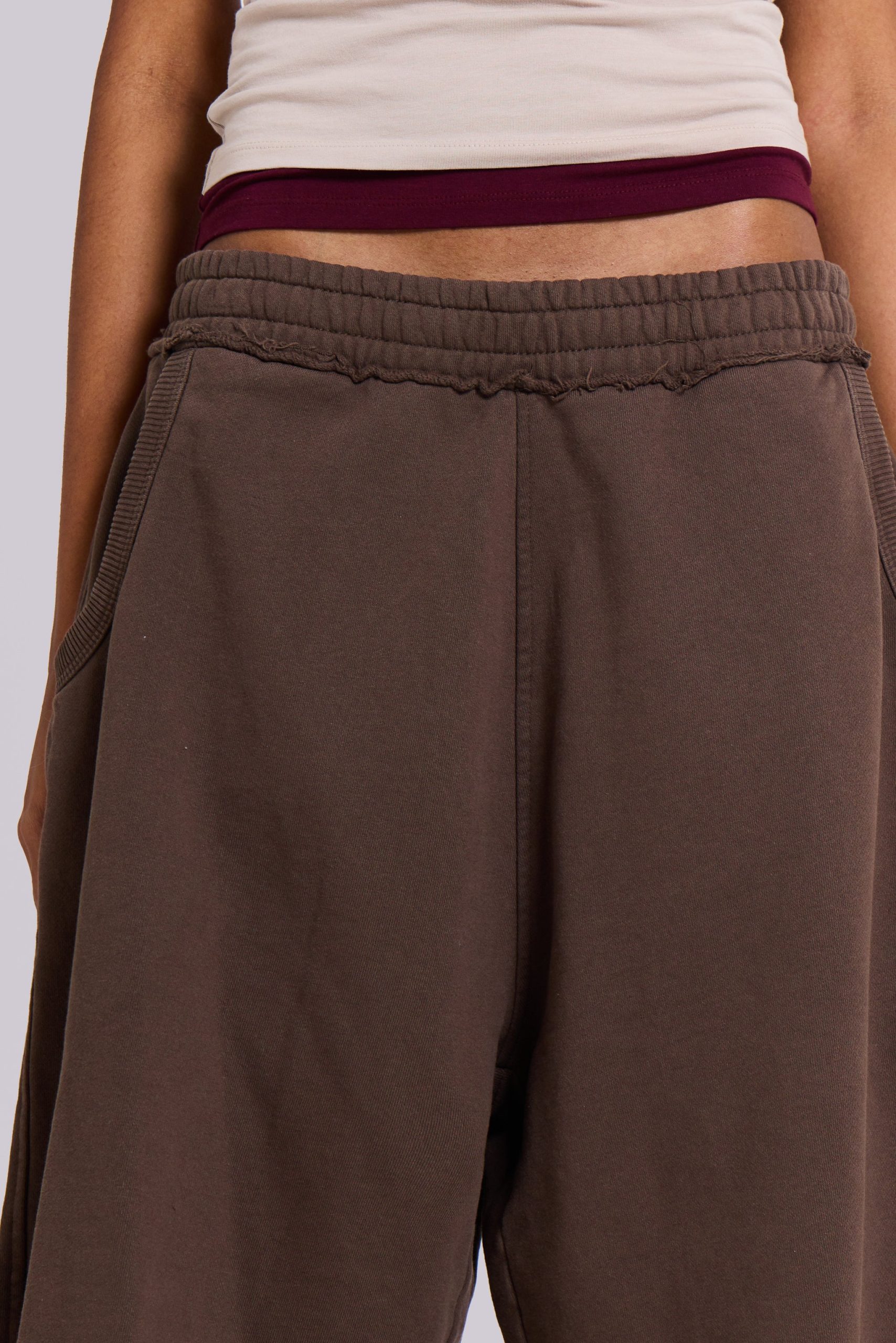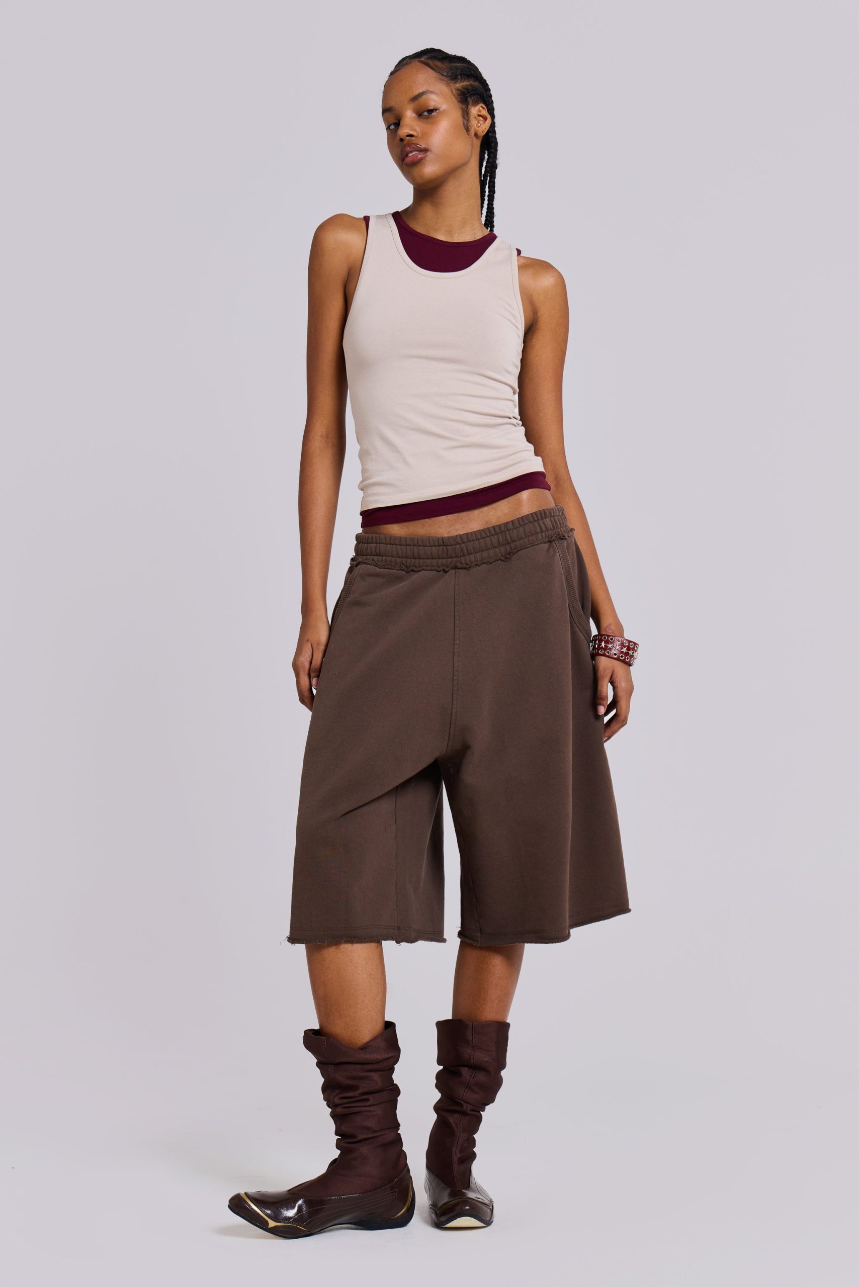The Chocolate Brown Monster Jogger Shorts are crafted from a fleece-back heavy sweat fabric boasting a super oversized fit, finished with raw-edge waistband details. These joggers are elevated with a length that falls just below the knee.