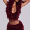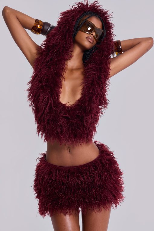 Haka Mongolian Faux Fur Backless Top. Hooded backless plunge Mongolian faux fur top in burgundy. Fastens with PU leather back strap.
