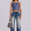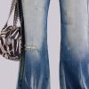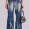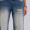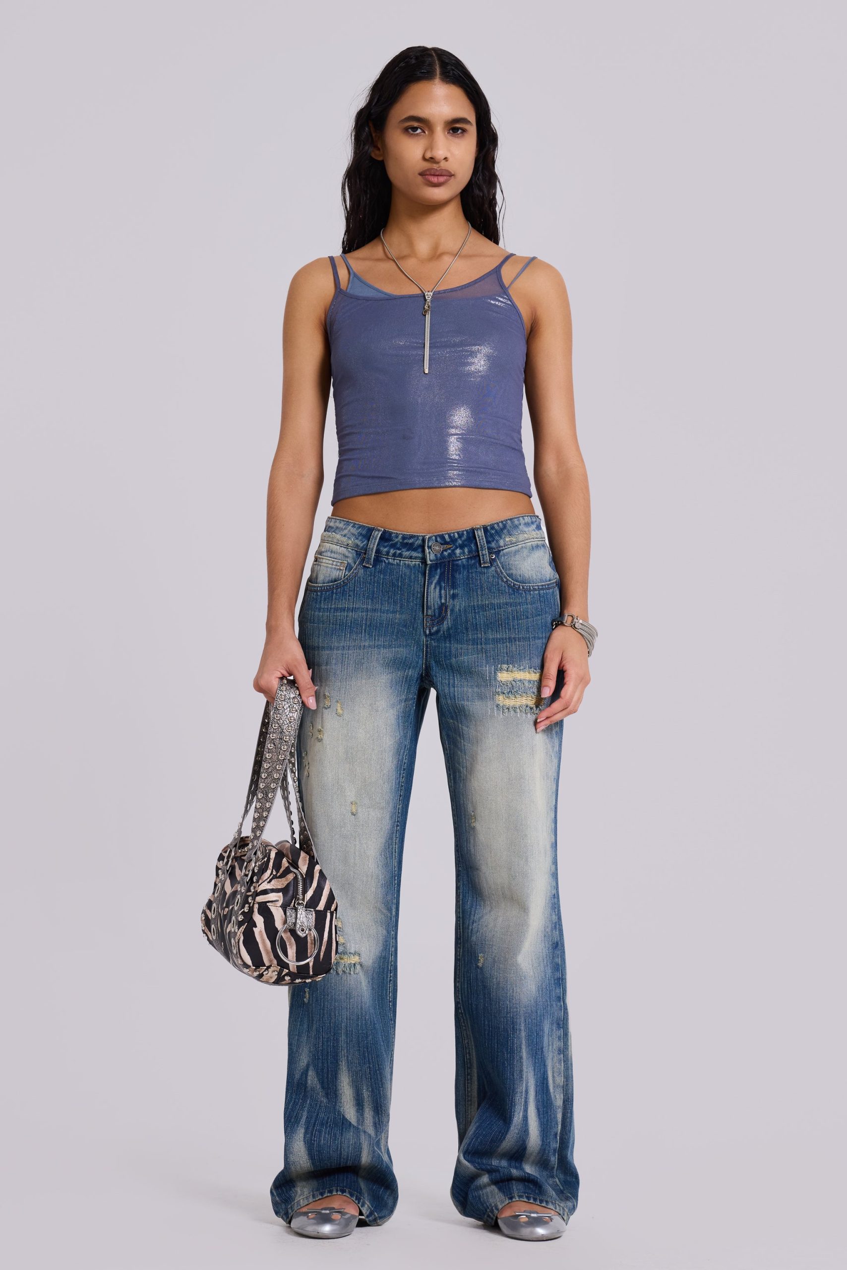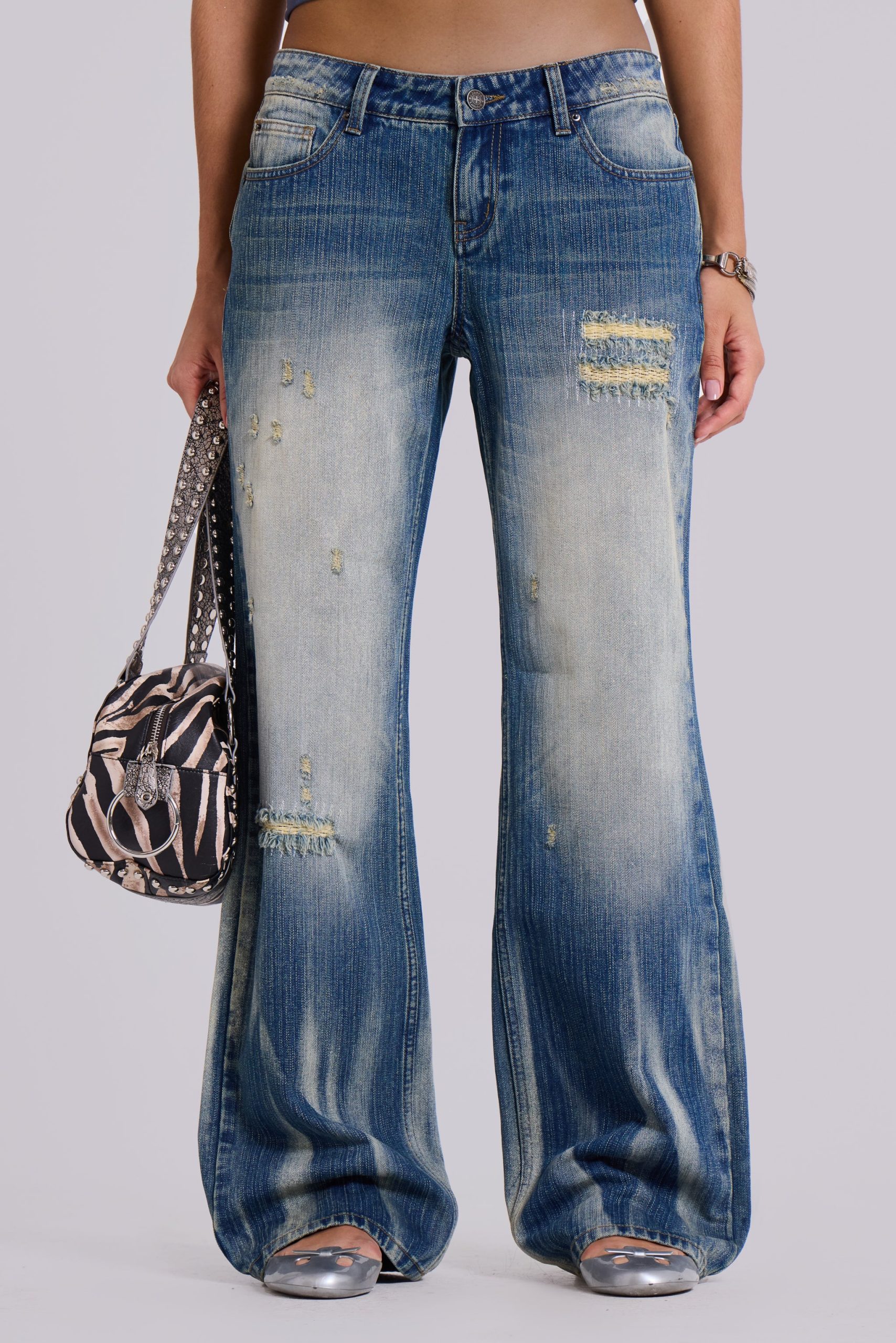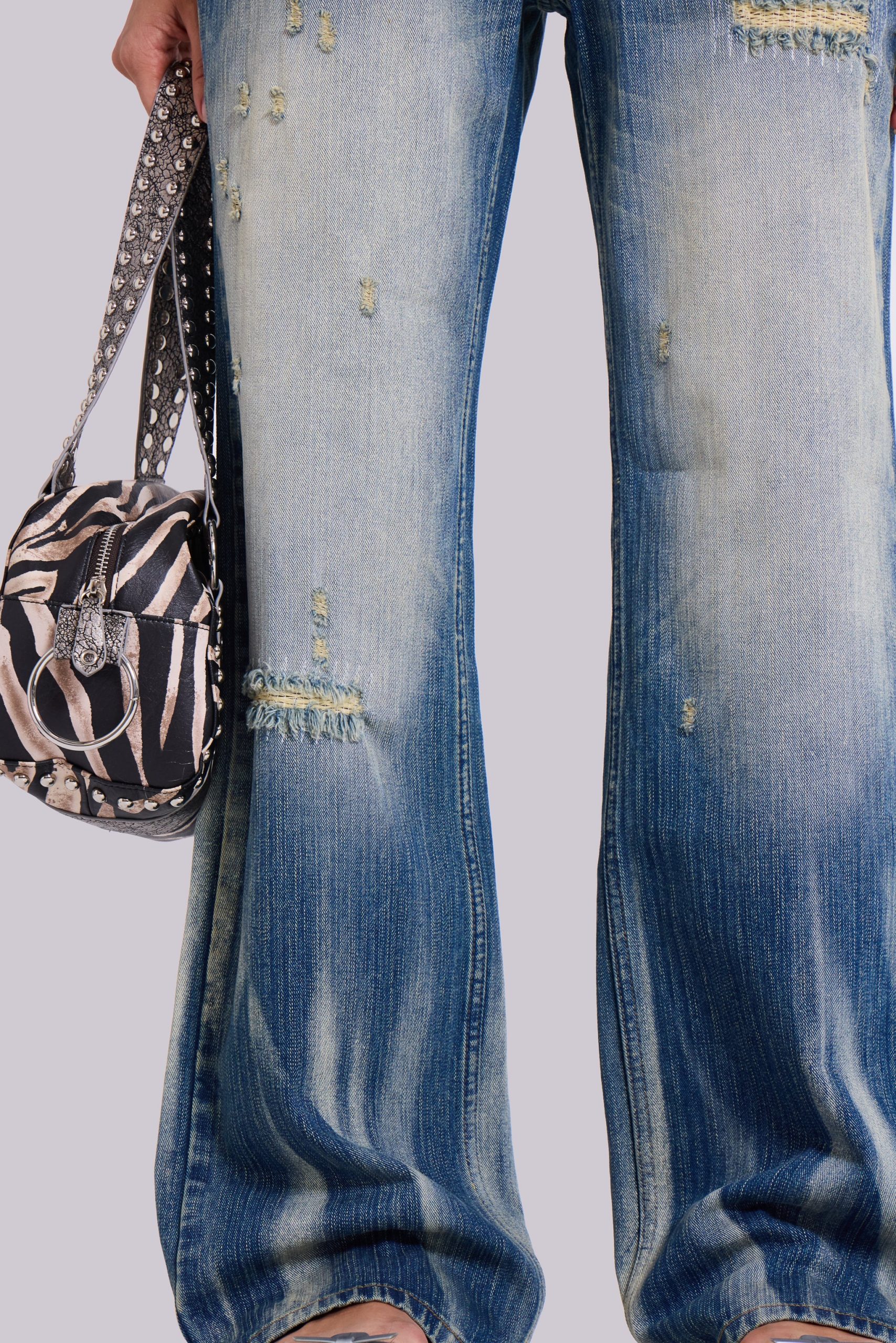 Low-rise loose straight leg fit denim jeans in mid blue distressed wash.