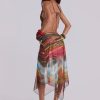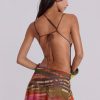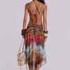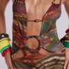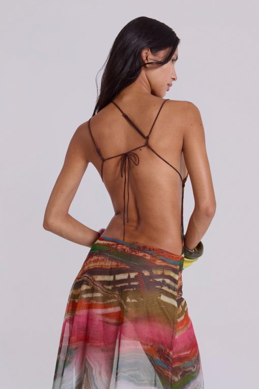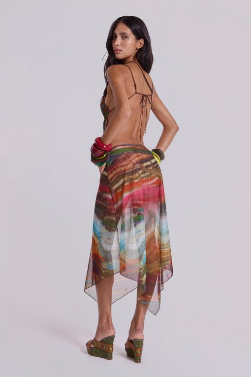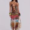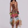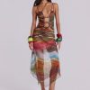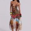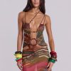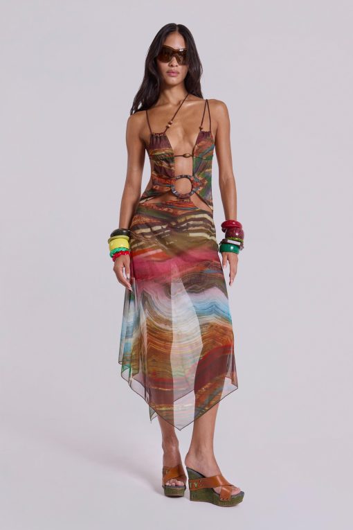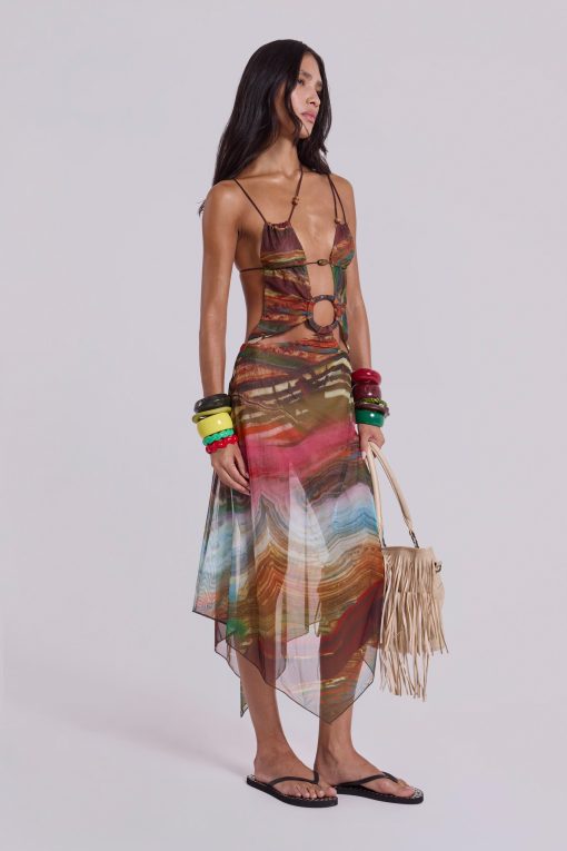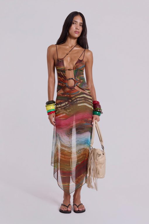 Printed mesh strappy midi dress with faux wooden trims