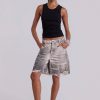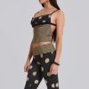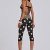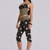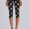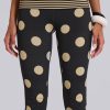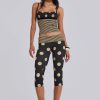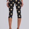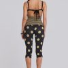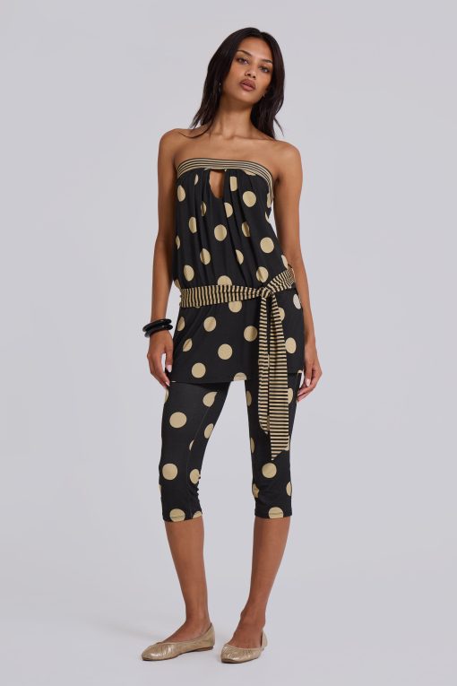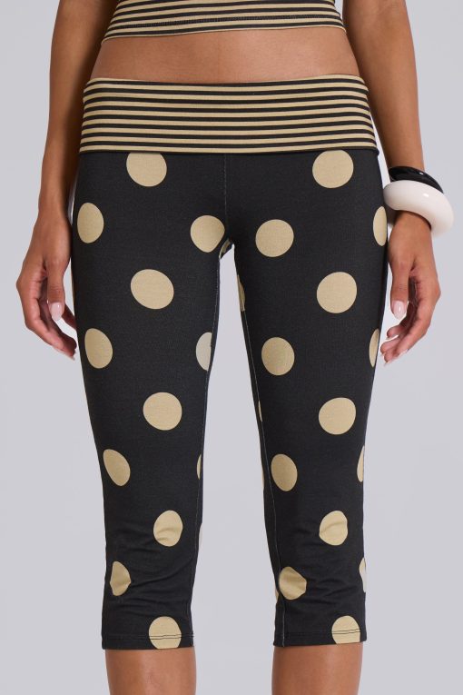 Contrast polka dot and stripe printed capri trousers with a fold-over waistband detail. Trousers have a low waist, tight leg silhouette.