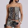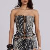 Washed zebra print denim longline halter corset with eyelet and lace up details.
