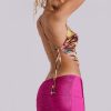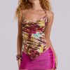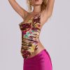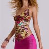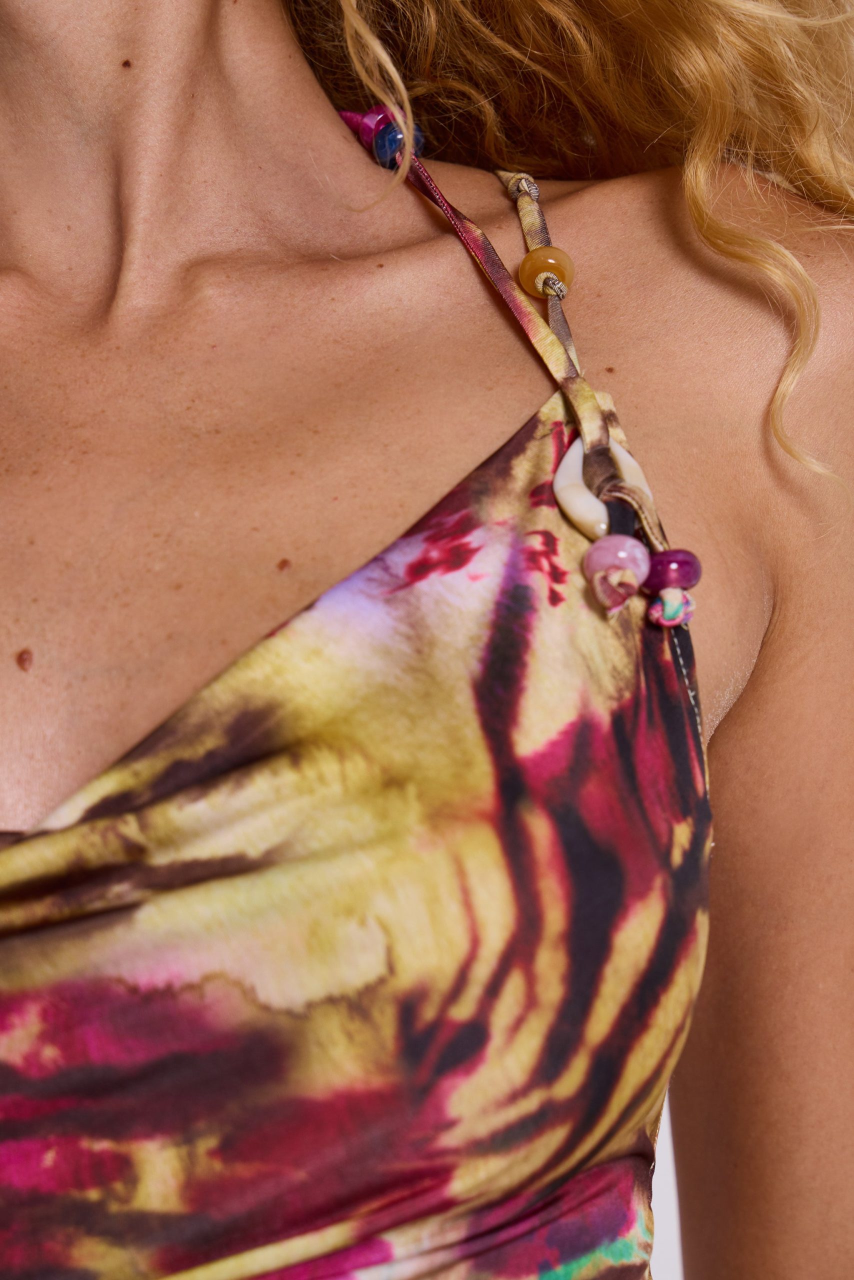 Printed jersey asymmetric top with cowl neckline and strappy beaded back detail