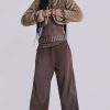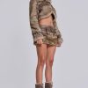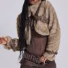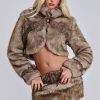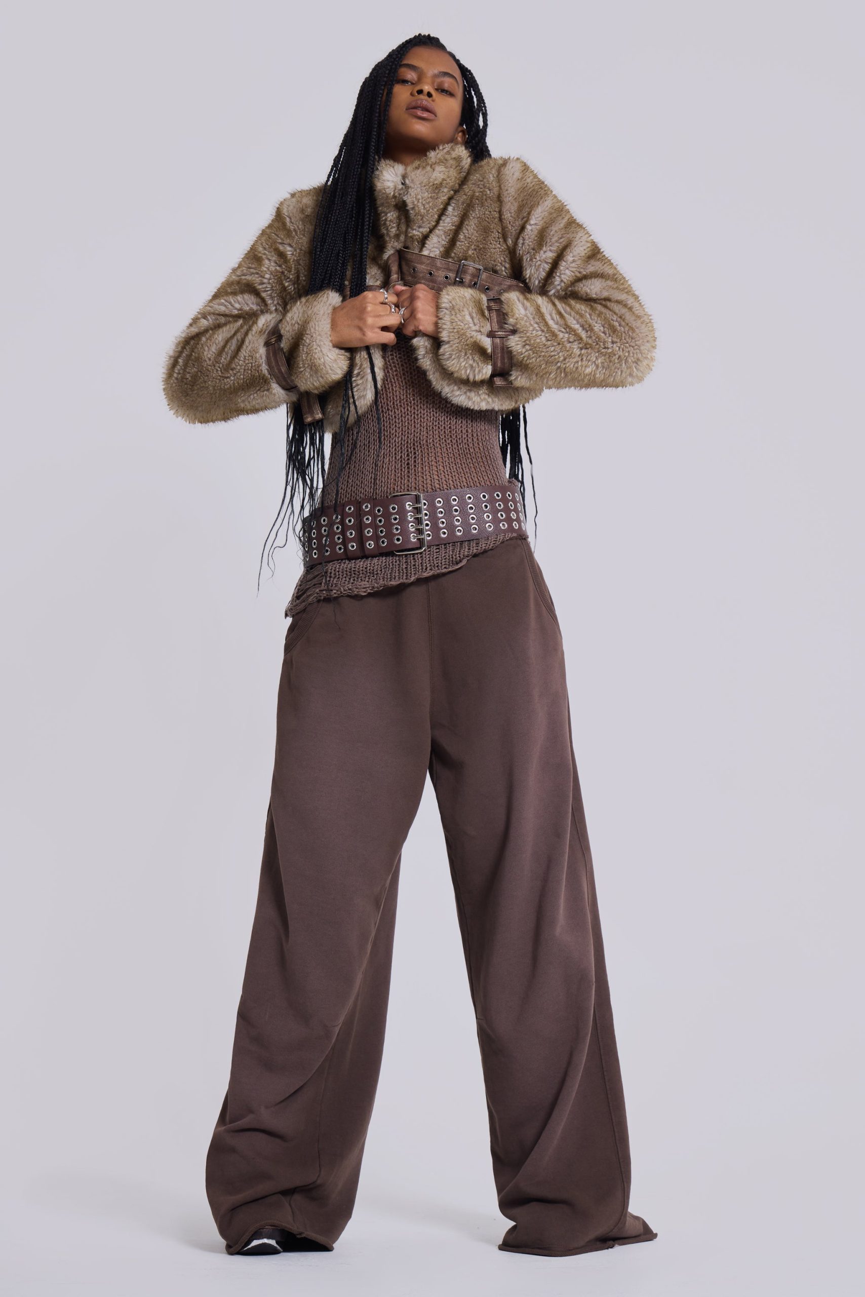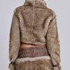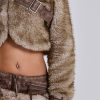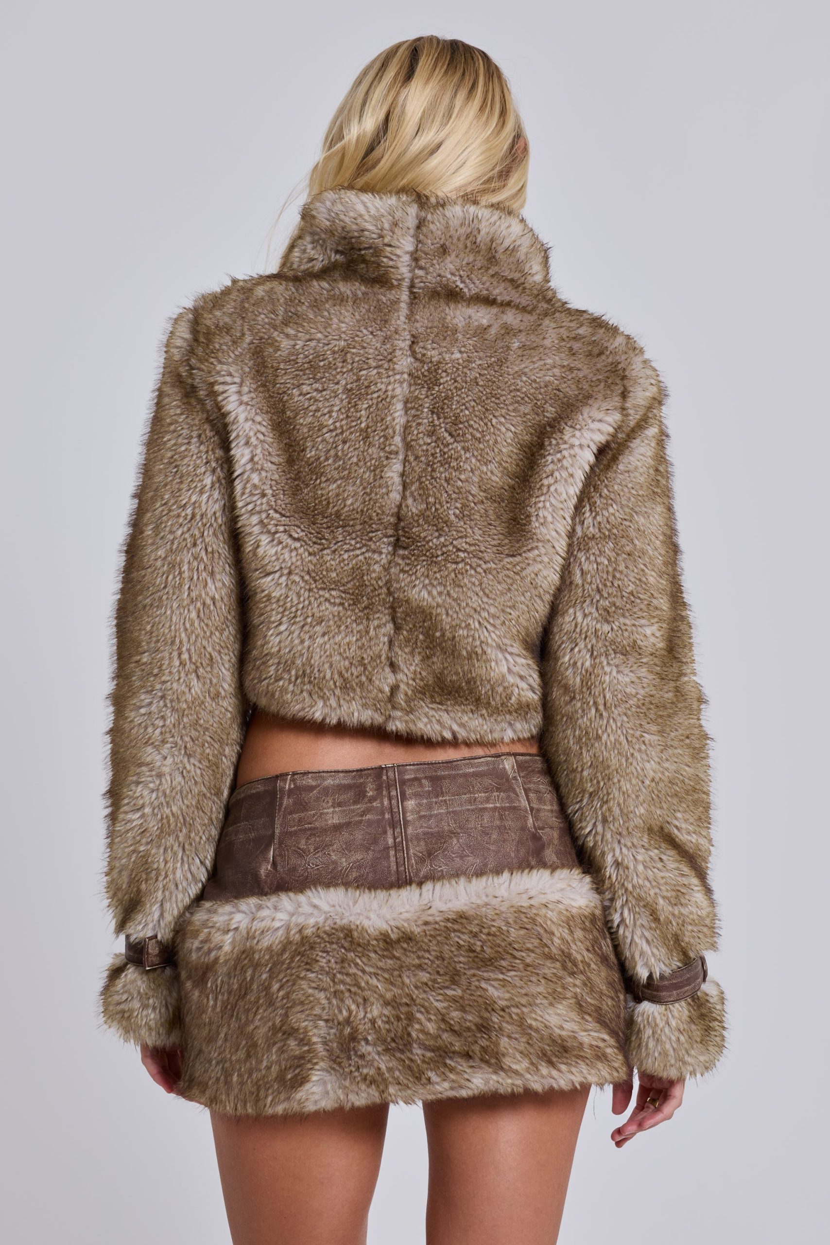 Cropped high neck faux fur jacket with faux leather belts.