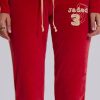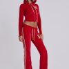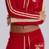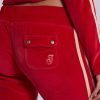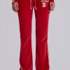 DescriptionThree Velour Low-rise Bootcut Trousers. Vintage red sporty low-rise bootcut trousers in soft-touch velour with a rib waistband, cream side stripes, drawcord and distressed embroidered logo detail.