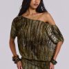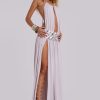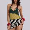 Rowa Asymmetric Knit Mini Dress. Halterneck mini dress with contrast stripe knit patterns.