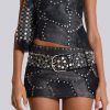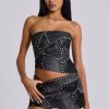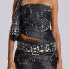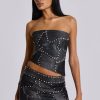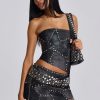 Shadow Studded Corset Top. Pu and faux suede panelled asymmetric corset with stud detailing around each panel. Studs are of varying size in silver colour.