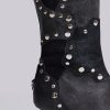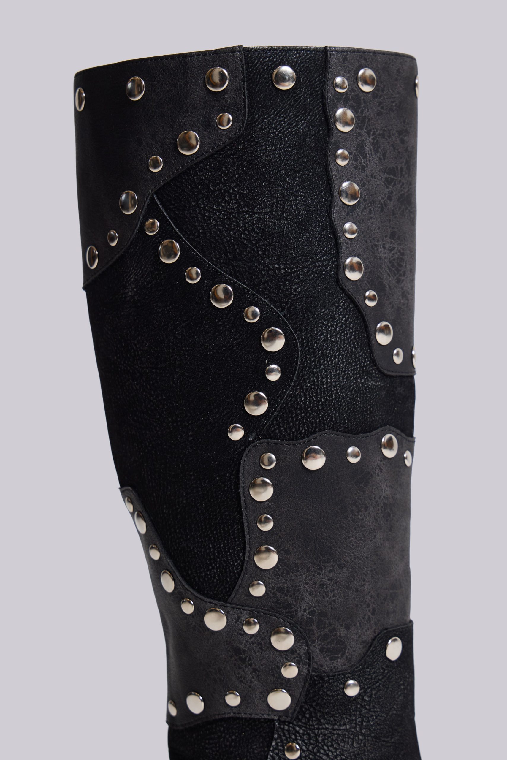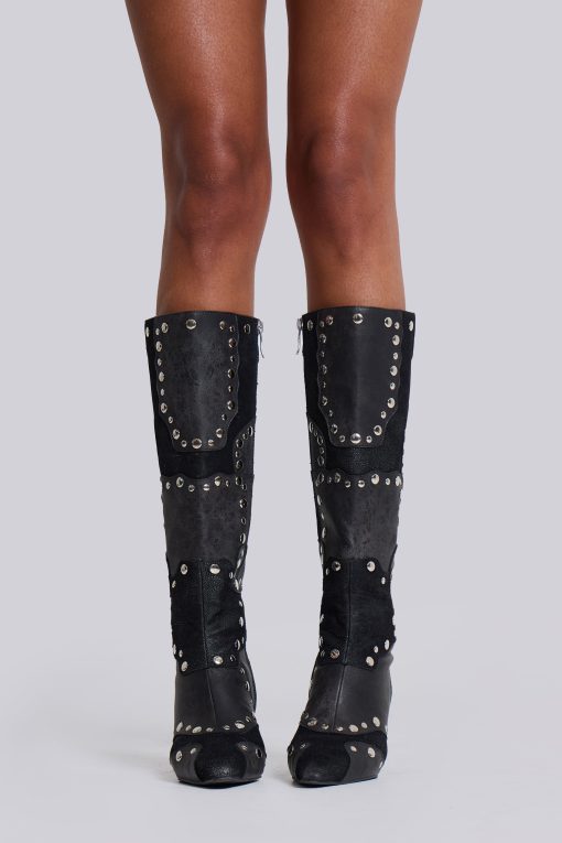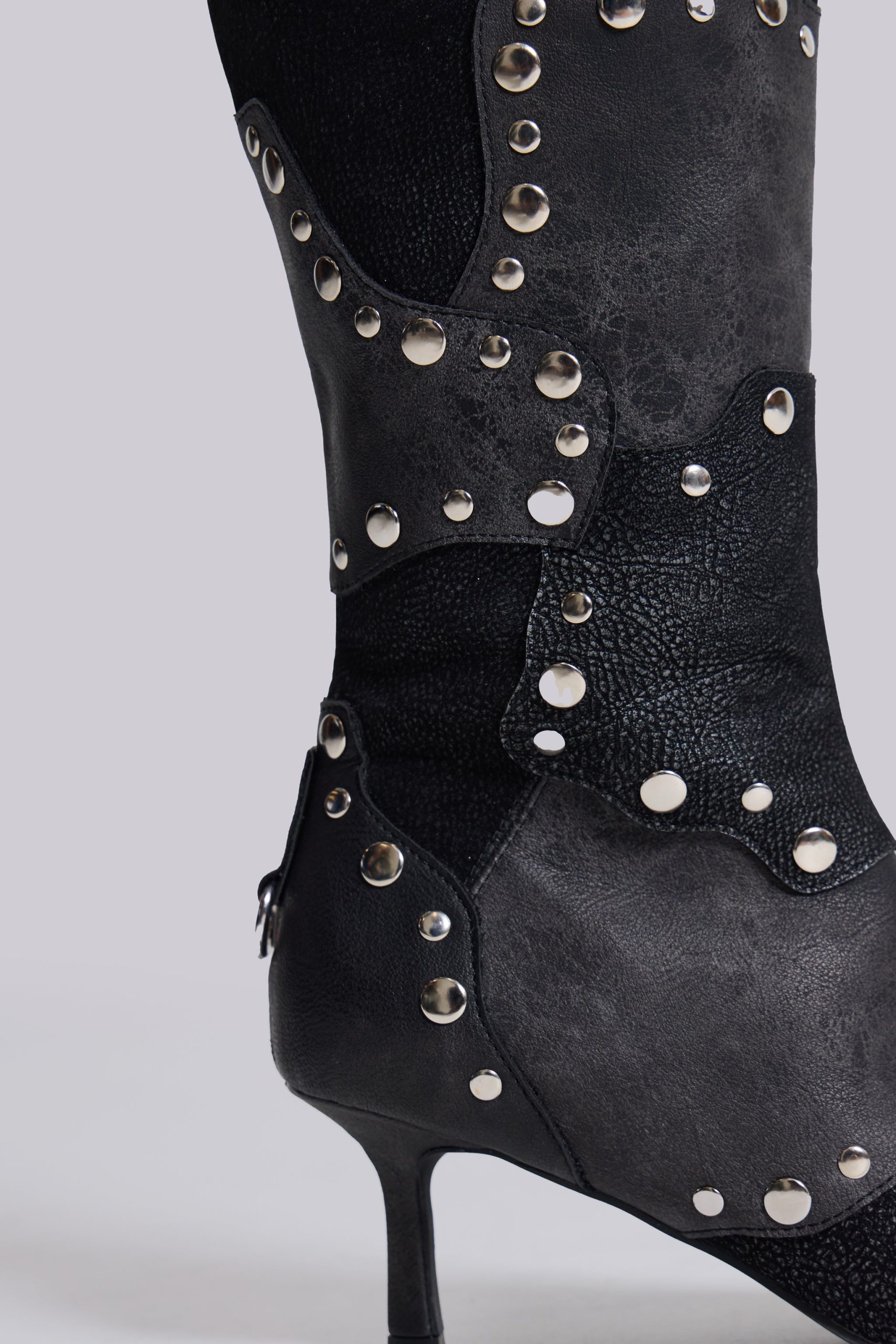 Shadow Studded Knee-High Boot. Black knee-high pointed heeled boot in faux vintage suede and faux washed leather with patchwork design and decorative shiny silver studs.