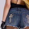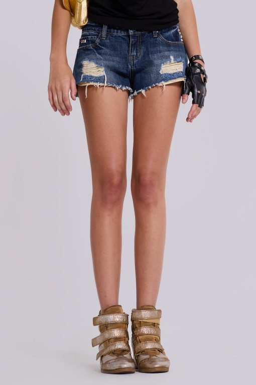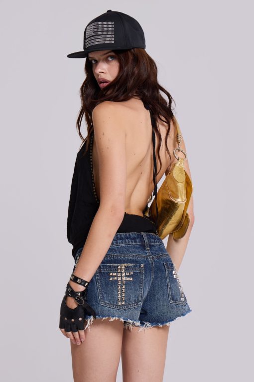 Mid blue vintage wash denim shorts with silver pyramid stud detail on back pockets.