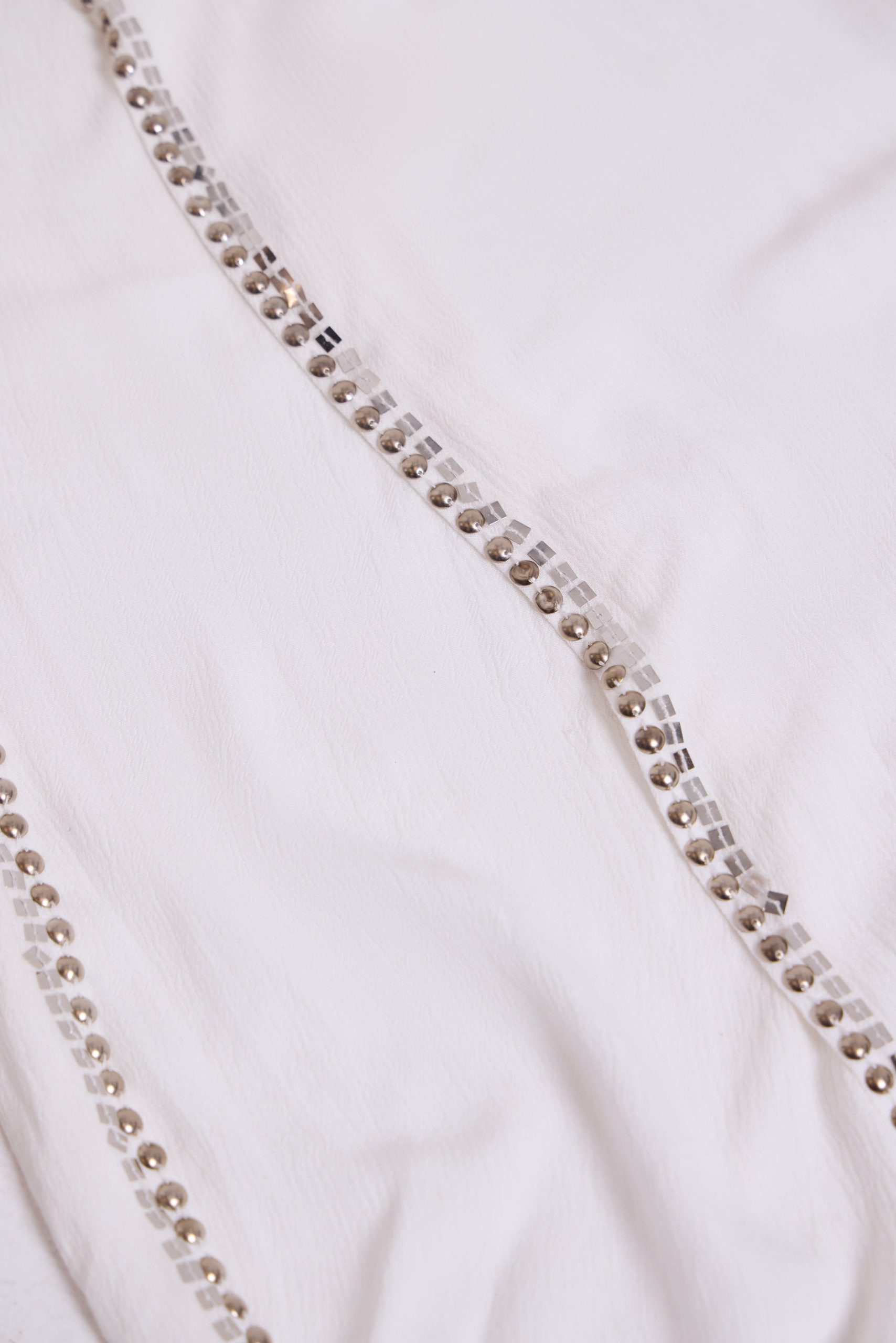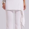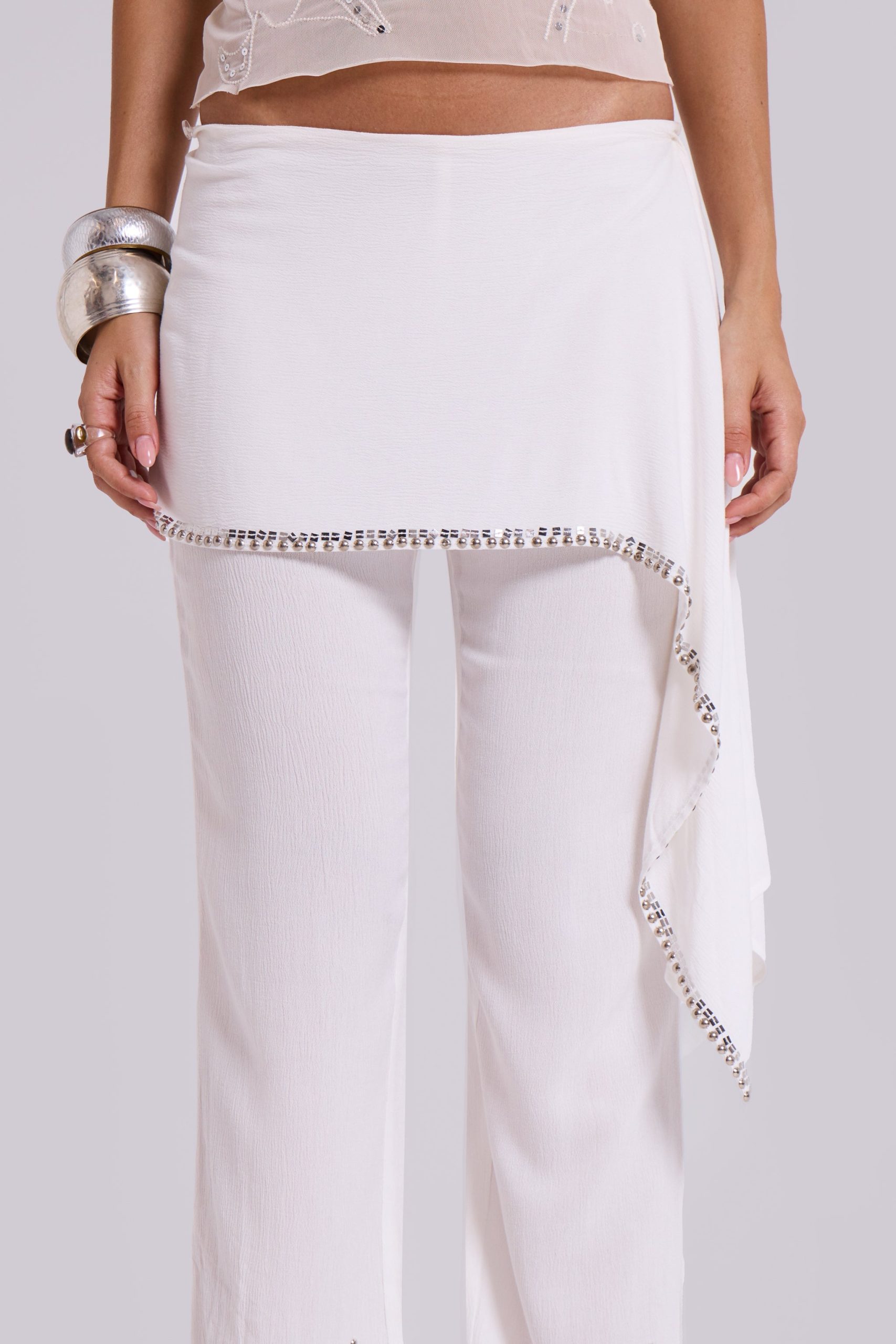 DescriptionWhite lightweight woven multiway skirt over trousers with stud and sequin embellishment. Skirt can button on and off to be worn separately.