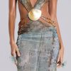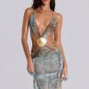 Printed plunge maxi dress which features real shell trim and beaded hip chains.